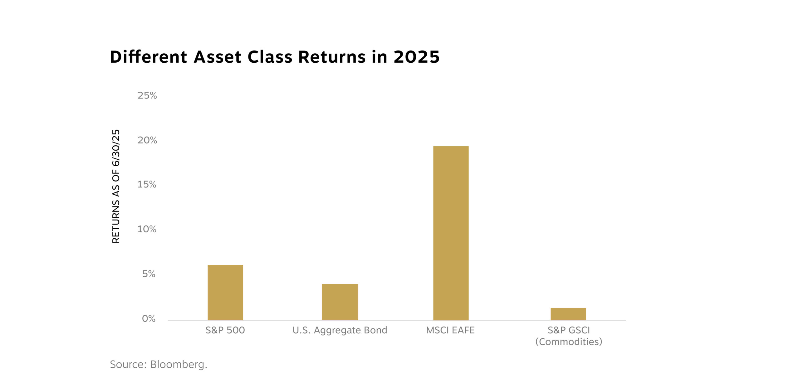 Foreign stocks have been a highlight—particularly in developed economies. The MSCI EAFE index has more than tripled the return of U.S. stocks year to date with a 19.4% first-half gain. Valuations remain compelling, and economic momentum abroad is beginning to firm up.